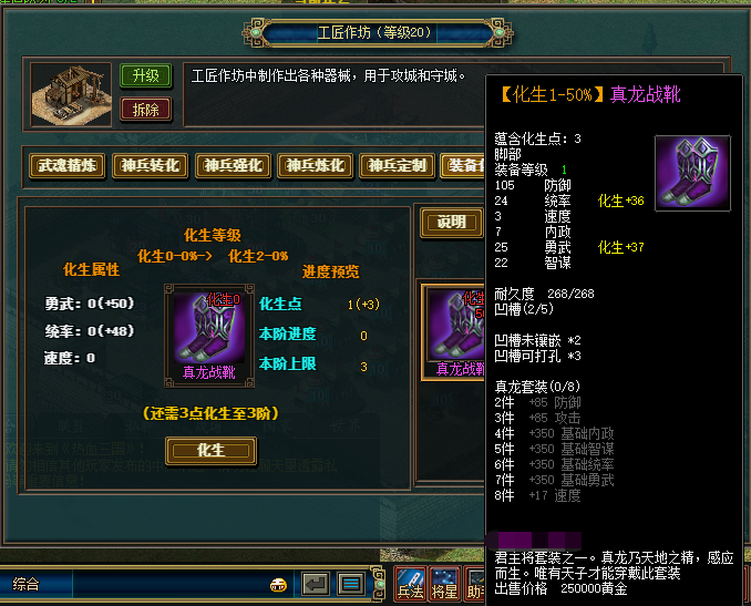真龙、天命、九霄套装新增化生点机制。上述套装作为材料时将转化为对应的化生点数。